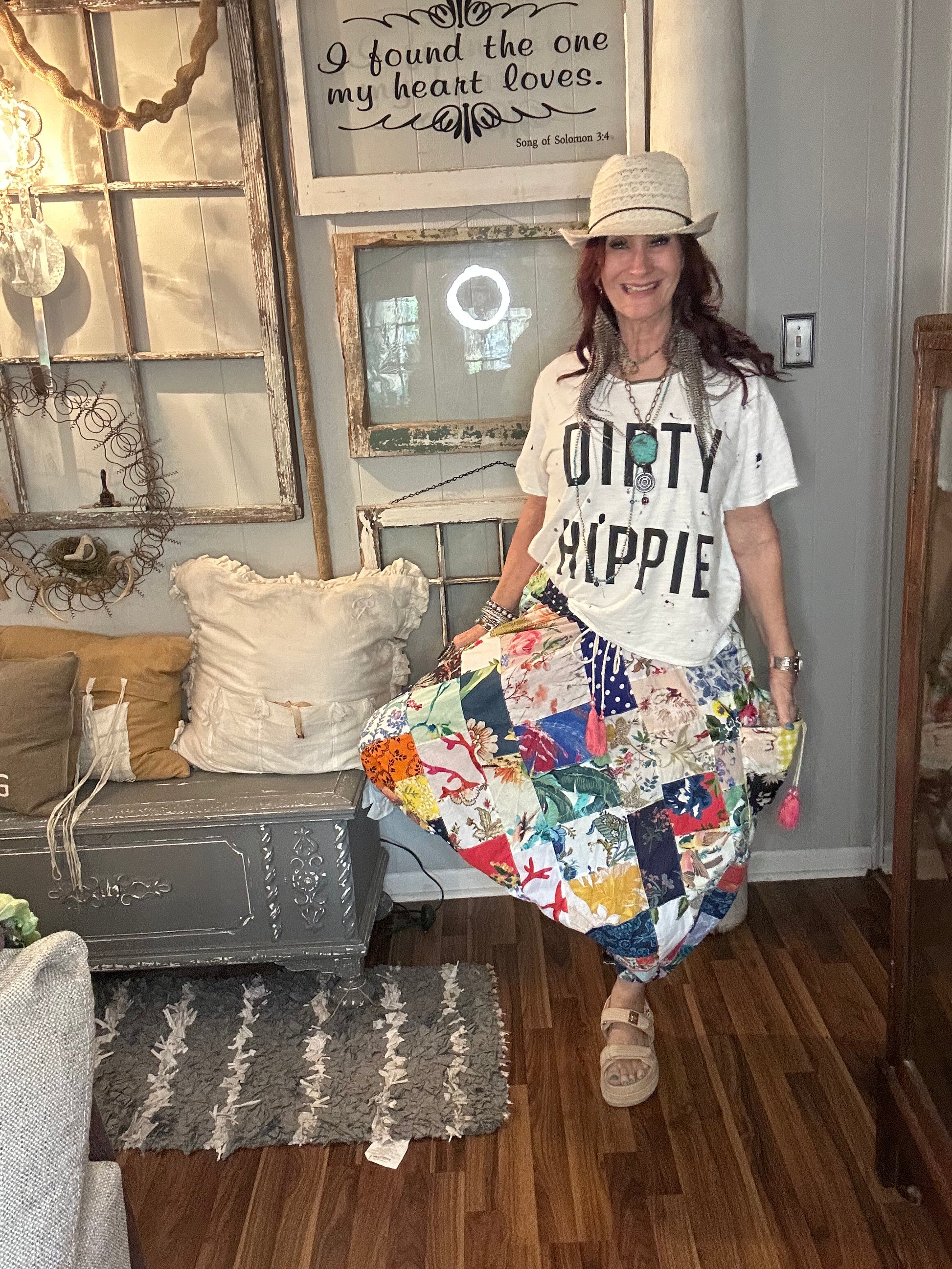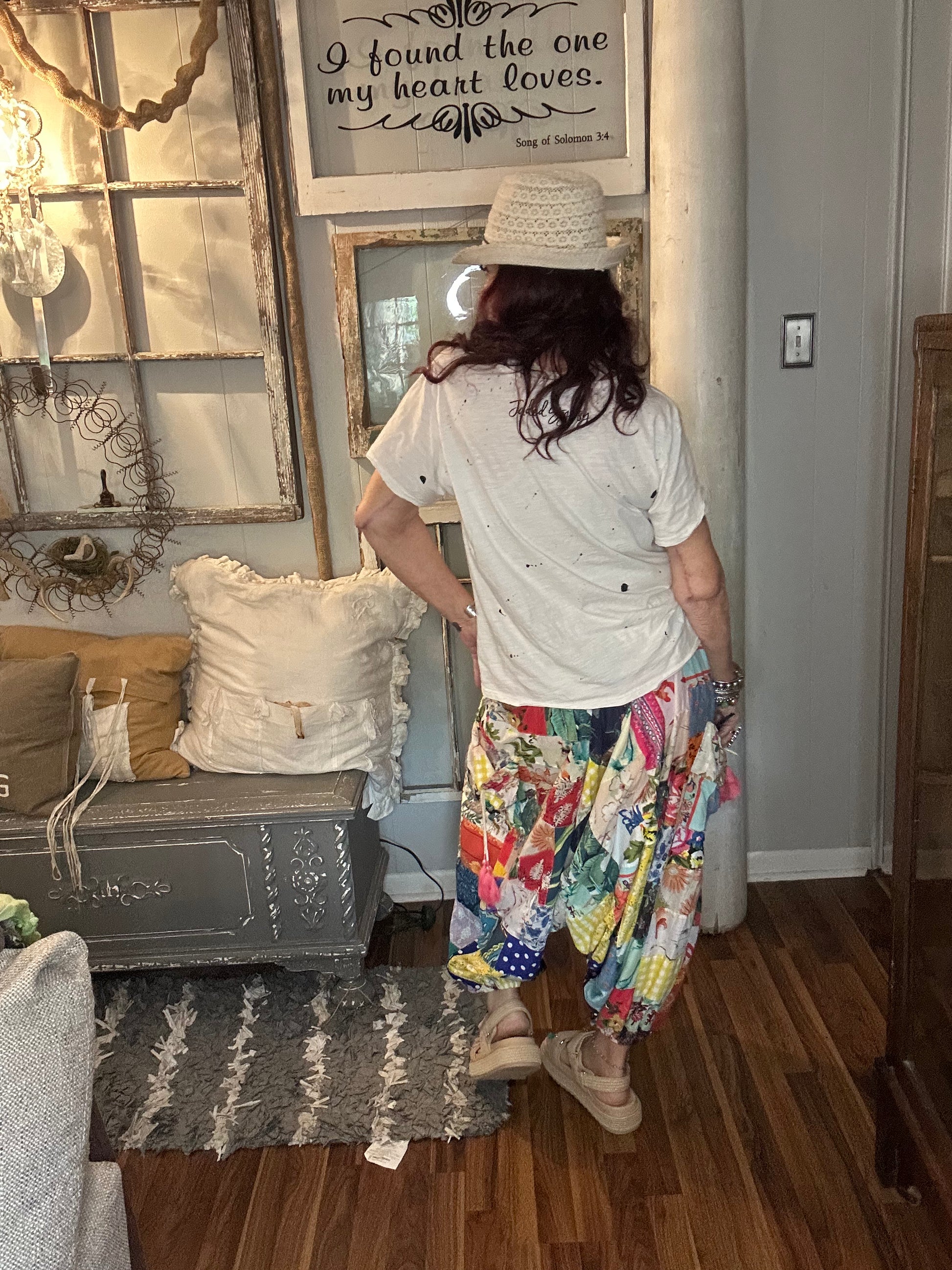 These flowy patchwork pants are crafted from a mix of beautifully curated prints, bringing together florals, vintage-inspired patterns, and pops of color in the most effortless way. Designed with a relaxed, oversized silhouette, they move more like a skirt while giving you the comfort of pants — making them perfect for wandering markets, dancing under the sun, or simply living free.